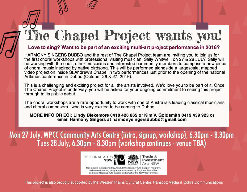 The Chapel Project’s creative team are very excited to have Sally Whitwell coming to Dubbon on July 27 & 28 to work with Harmony Singers Dubbo, community members interested in being part of the project AND high school students involved in choir, band or elective music, as well as their teachers.